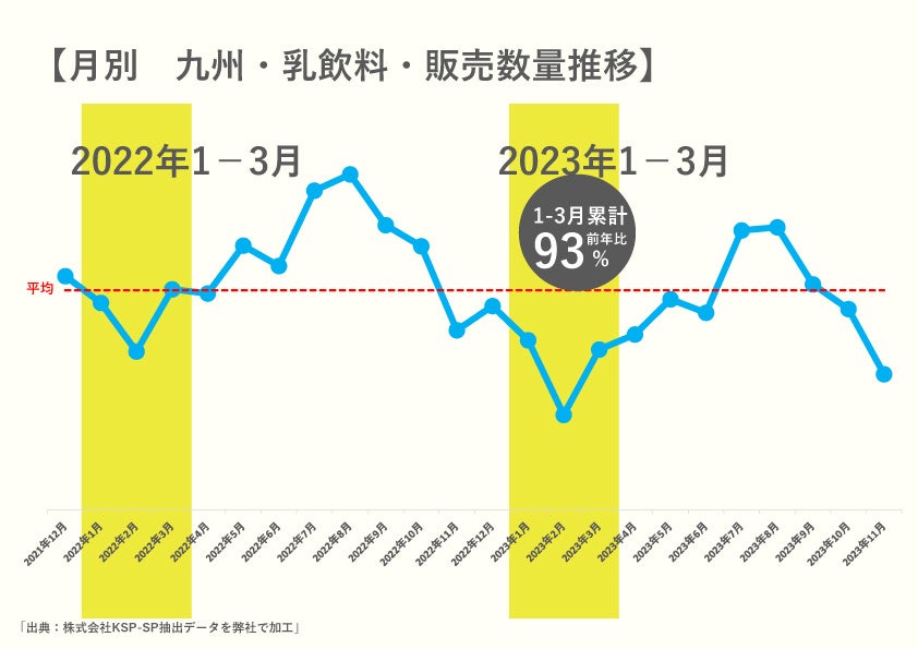 九州地区2023年1-3月の乳飲料販売数量は前年比93%。