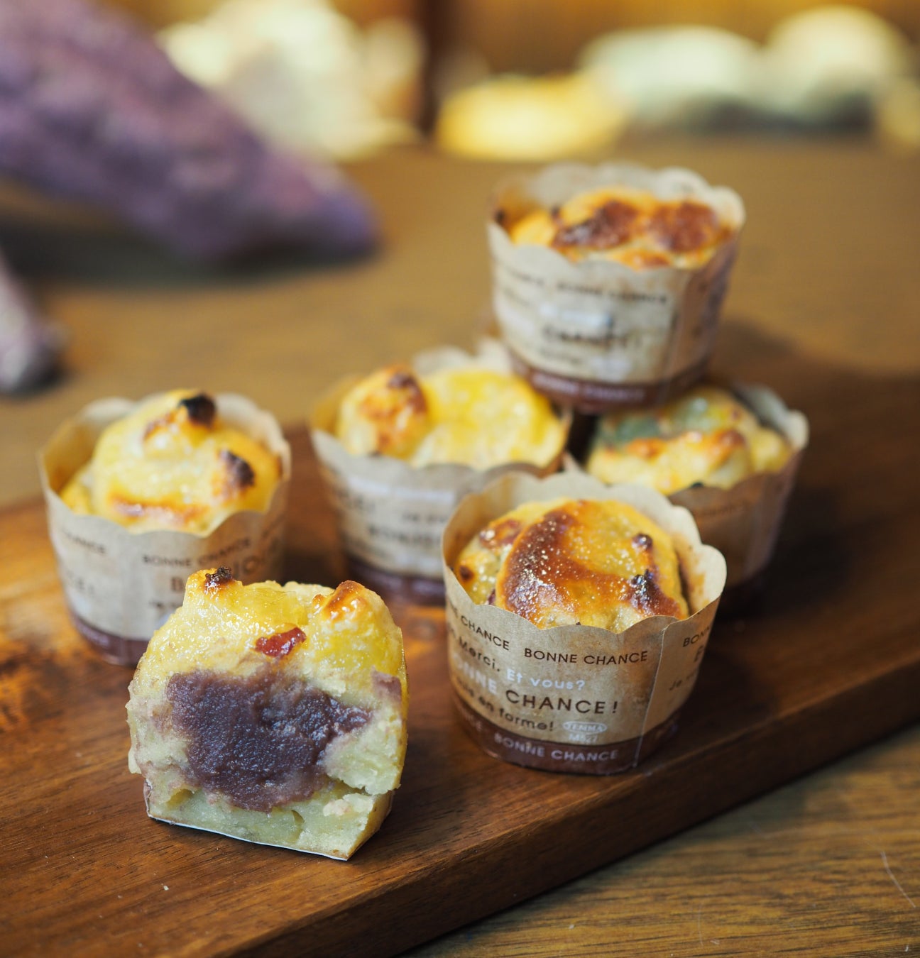 角切りのさつま芋を氷砂糖で蜜漬けしてつぶつぶ感をだした特製の蜜漬け芋とホイップした卵と米粉を合わせた生地をカップに流し込み、こしあんをサンドして焼き上げました。