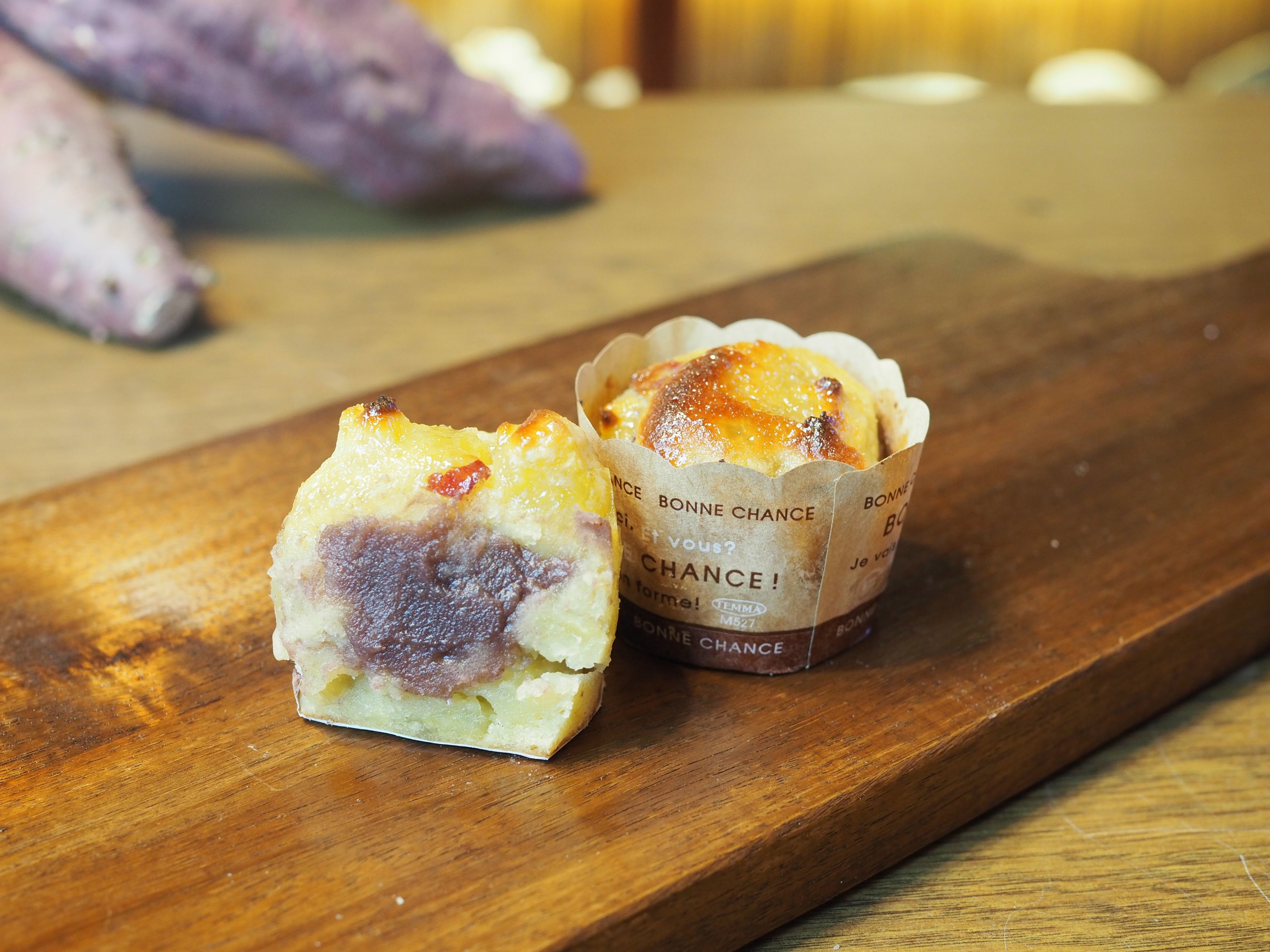 角切りのさつま芋を氷砂糖で蜜漬けしてつぶつぶ感をだした特製の蜜漬け芋とホイップした卵と米粉を合わせた生地をカップに流し込み、こしあんをサンドして焼き上げました。
