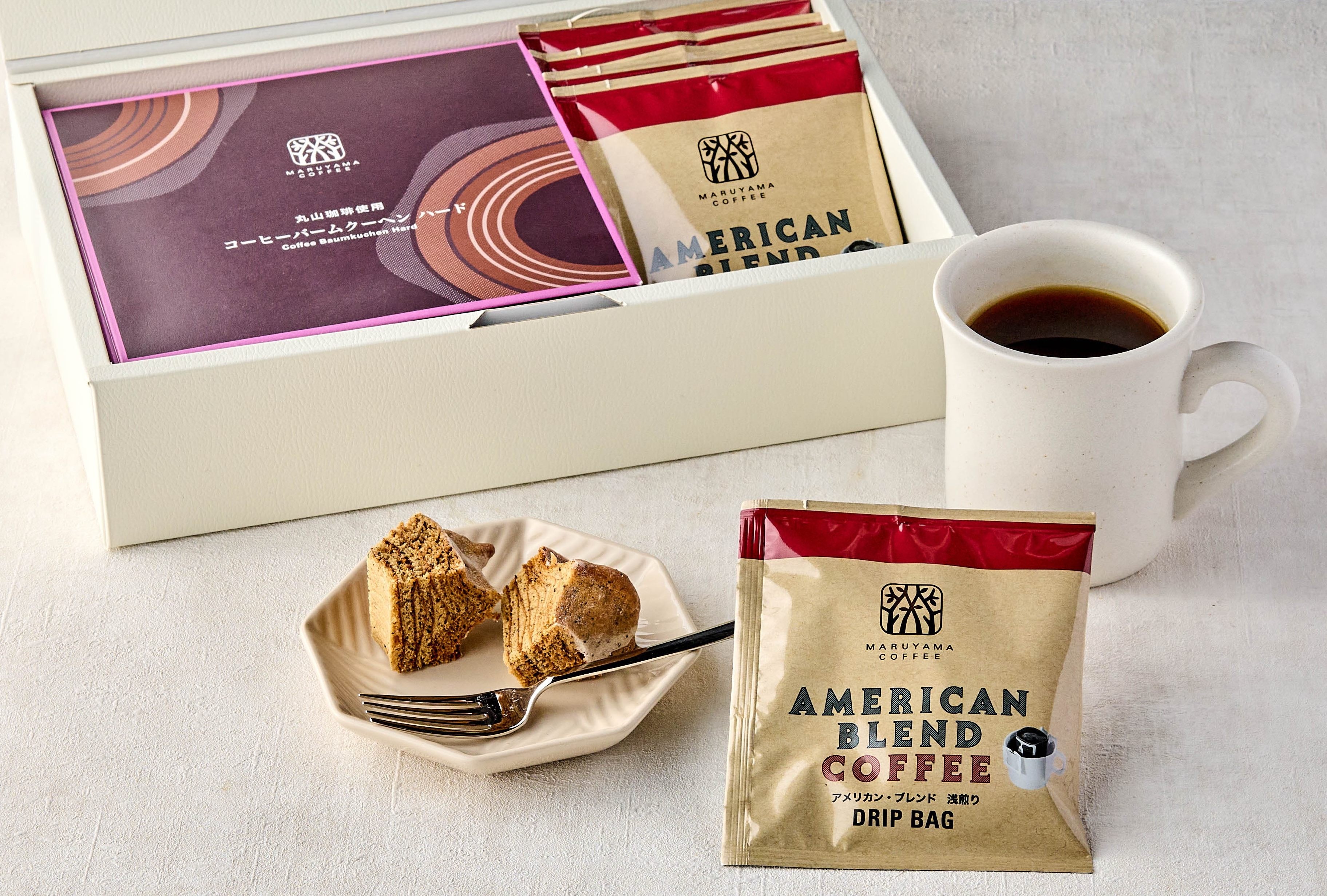 「アメリカン・ブレンド 浅煎り」をギフトセットでもご用意しました。お気軽に楽しんでいただけるドリップバッグやコーヒーバッグと「丸山珈琲オリジナル コーヒーバームクーヘン ハード」(ホールタイプ)とセットでお届けします。