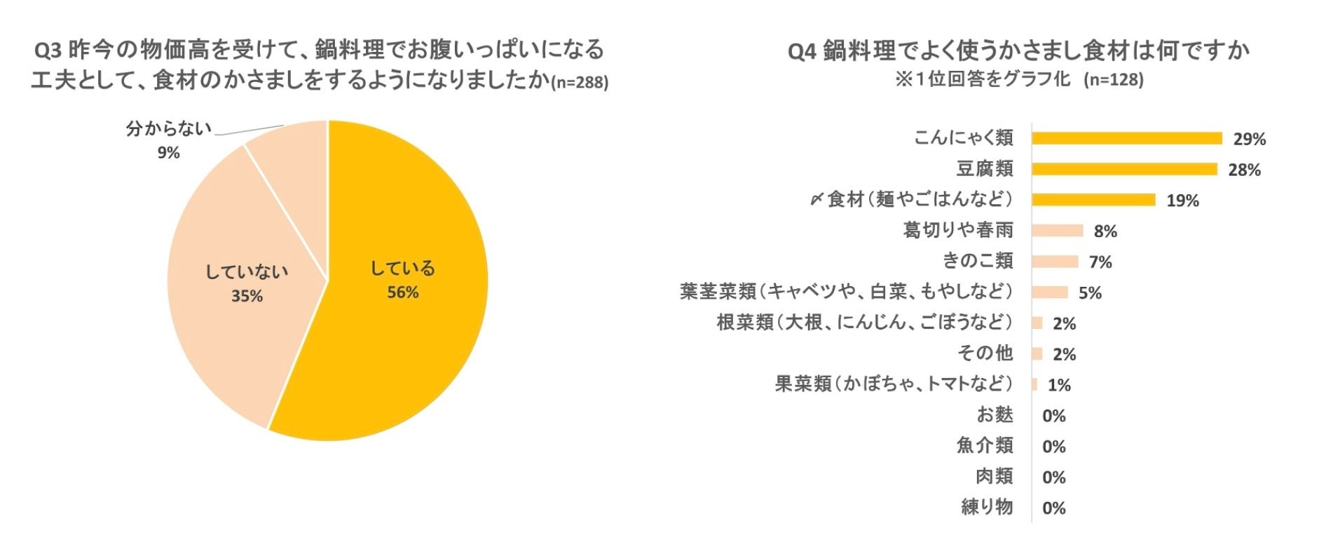 この内、特に高頻度(週2回以上)で鍋を食べる人を対象に、昨今の物価高による鍋の頻度への影響を聞くと、43%が頻度が上がった(上がりそう)と回答(Q2)。また、56%が、鍋料理でお腹いっぱいになる工夫として、食材のかさましをしていると回答しました(Q3)。