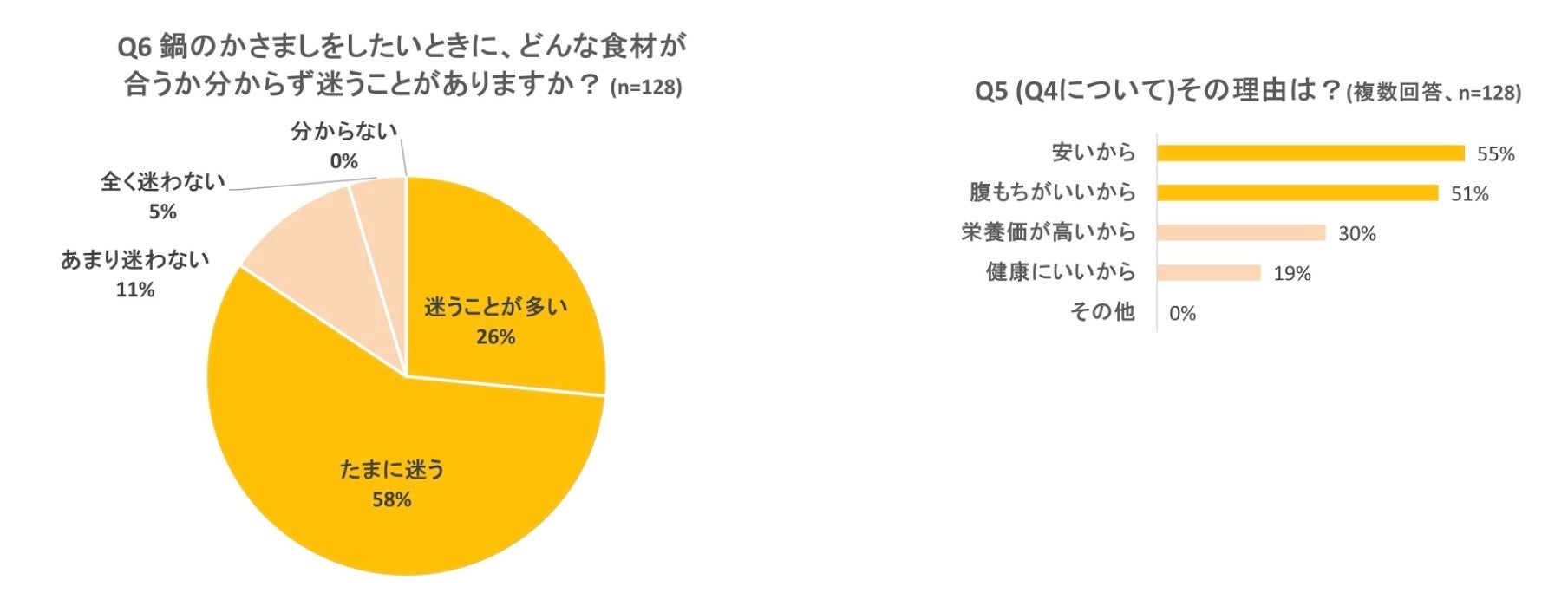 かさましによく使う食材としては、こんにゃく類、豆腐類、〆食材(麺やごはんなど)が上位に挙がりました(Q4)。また、その食材をよく使う理由としては「安いから」「腹持ちがいいから」に回答が集まり、家庭での節約の工夫が明らかになりました(Q5)。その一方で、84%が、鍋のかさましをするときにどんな食材が合うか分からないことがあると回答(Q6)。様々なバリエーションを家庭で楽しめる鍋料理ならではの悩みが見て取れます。