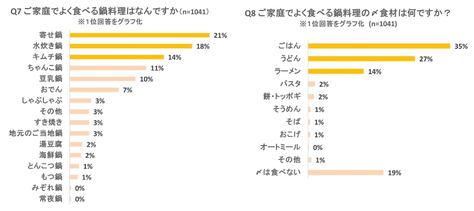 ご家庭で最もよく食べる鍋を聞いたところ、上位に寄せ鍋、水炊き鍋、キムチ鍋が挙がりました。その他、ちゃんこ鍋や豆乳鍋、おでんなどにも一定の回答が集まり、各家庭ごと様々な好みがあることが分かりました(Q7)。