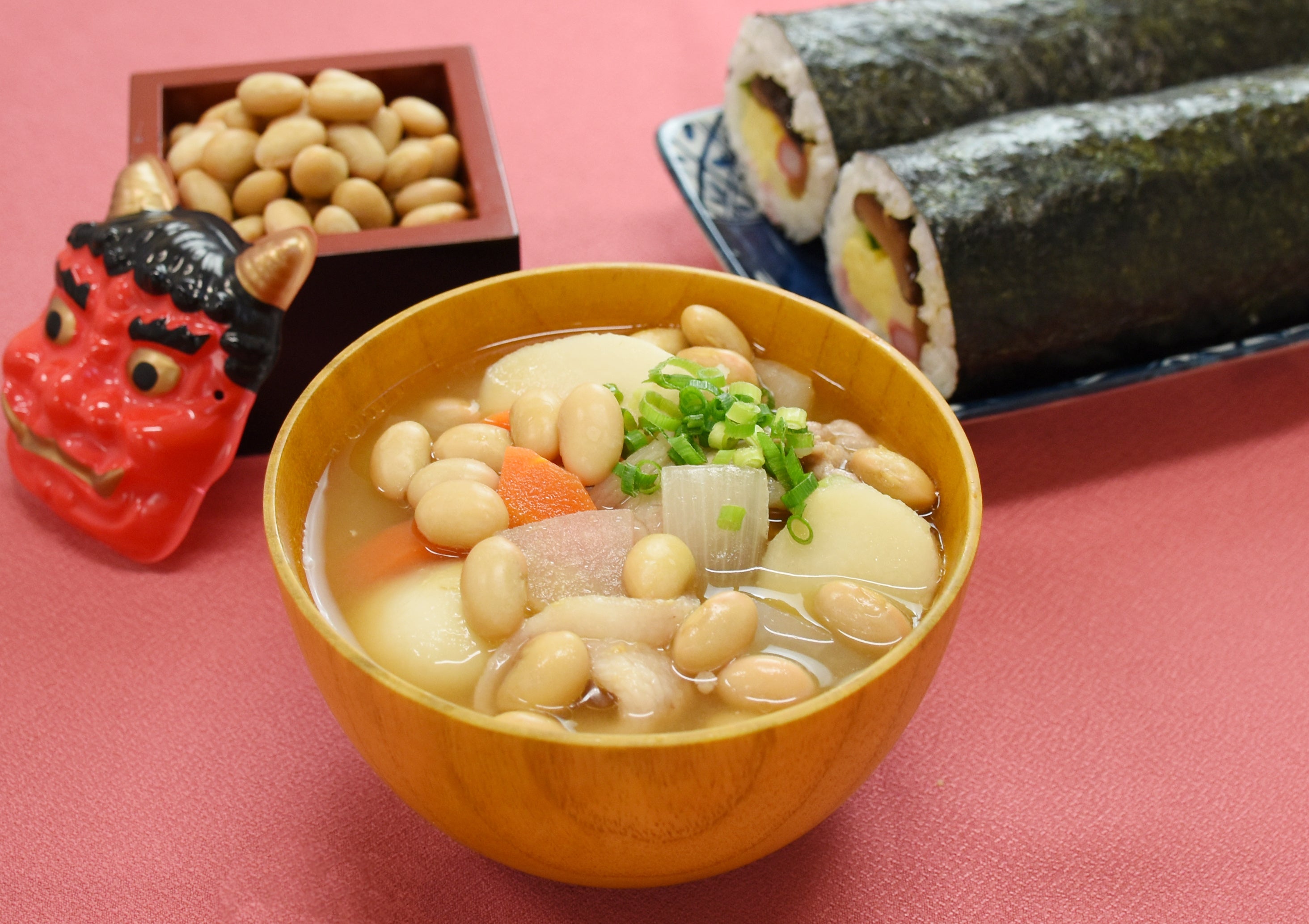 『鬼除け汁(節分汁)』とは豚汁に蒸し大豆を歳の数加えたもの。節分に恵方巻だけを食べると栄養が偏りがちですが、豚汁に蒸し大豆を加えただけの『鬼除け汁(節分汁)』をプラスすれば、大豆を簡単に歳の数食べられるだけでなく、根菜の食物繊維や豚肉、大豆のたんぱく質等で、献立として栄養バランスを整えることができます。