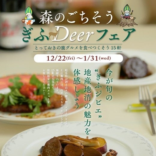 2023年 12月22日(金)~2024年1月31日(水) 岐阜県内の飲食店で、岐阜県の鹿肉を使用した鹿料理を楽しんでいただける「森のごちそう ぎふDeerフェア」を開催致します。ぜひ旬のジビエをお楽しみください。