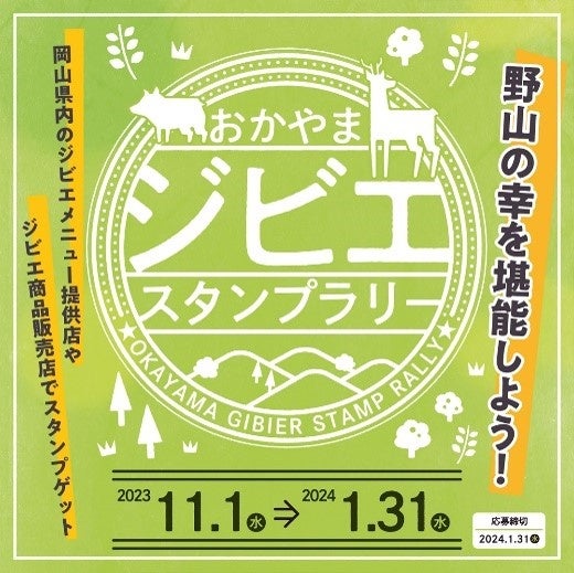 11月1日から「おかやまジビエスタンプラリー」を開催中!県内のジビエメニュー提供店やジビエ商品販売店でスタンプを集めて応募いただくと、抽選でジビエ加工食品や革製品が当たります。