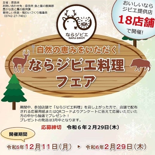 12月11日より「ならジビエ料理フェア」を開催中!県内18店舗で自慢のならジビエ料理をご提供。各店舗で配布されるプレゼント応募用紙のアンケートに答えて応募すると、抽選で食事券等が当たります。