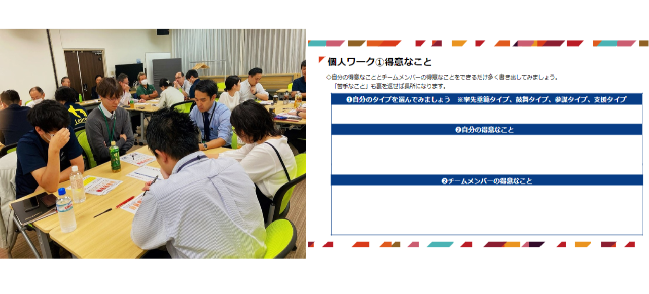 フレームワーク「タックマンモデル」、組織の役割について講義を行い、最後に自社や個人の特長をワーク形式でまとめ、学びの理解を深めました。