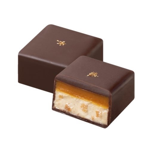 名古屋の味噌文化を支えてきたナカモの「つけてみそかけてみそ」と、人気のおいもスイーツ専門店「おいもや」の食材を使ったひと粒です。「おいもや」の安納芋を味わえるクリーミーなムースと、「つけてみそかけてみそ」を使った味噌キャラメルをダークチョコレートで包み、日本料理の奥深さを象徴するような甘さと塩味のハーモニーを楽しめるひと粒に仕上げました。フィユティーヌを加えることで、サクサクの食感が全体の味わいを引き立てています。