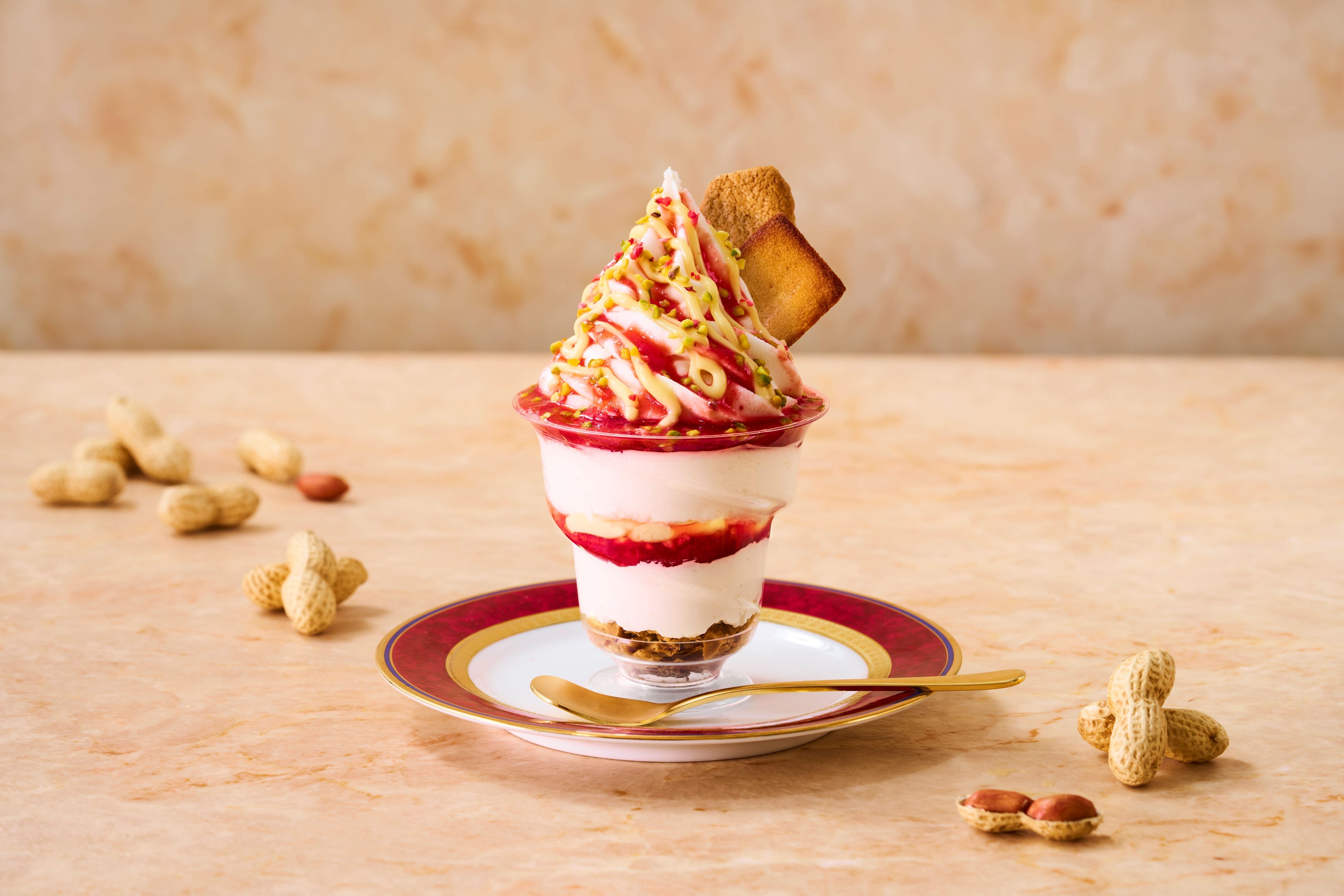 風味豊かなピーナッツといちごの甘酸っぱさが、なめらかでコクのあるミルクソフトクリームにベストマッチ!トップにはいちごピューレにドライいちご。センターには果肉入りのいちごソースをしのばせピーナッツを引き立てます。
