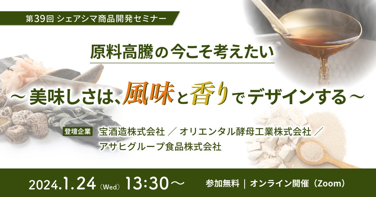 2024年1月24日(水)に開催する第39回セミナーは、原料高騰の今こそ考えたい~美味しさは、風味と香りでデザインする~。原材料の高騰が進む中、食品業界でもコストアップをカバーする対策が求められています。当セミナーでは、風味や香り・呈味を増強する効果のあるエンハンス原料や、素材の旨みを凝縮したエキス調味料など、食品の美味しさ・品質にこだわりながらも、コスト見直しに効果的な食品原料について各社よりご提案いただきます。登壇企業の方々へ直接質問できるコーナーもございます。ぜひ、ご参加ください。