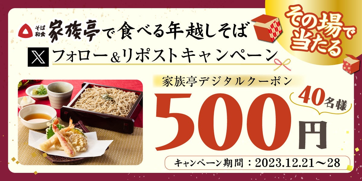 株式会社家族亭(本社・大阪府大阪市、代表取締役社長・坪山 憲司)が運営するそば和食チェーン「家族亭」は、2023年12月21日(木)~12月28日(木)の期間に「家族亭デジタルお食事券500円分」が40名様にその場で当たるXキャンペーンを開催致します。家族亭の公式Xをフォローし、キャンペーンポストをリポストすることで参加ができ、その場で結果が分かります。「家族亭デジタルお食事券」は店内飲食、テイクアウトでご利用でき、家族亭の年越しそばの購入にもご利用いただけます。家族亭公式Xでは、いち早く最新の情報などを投稿しておりますので、ぜひフォローしてお楽しみください。