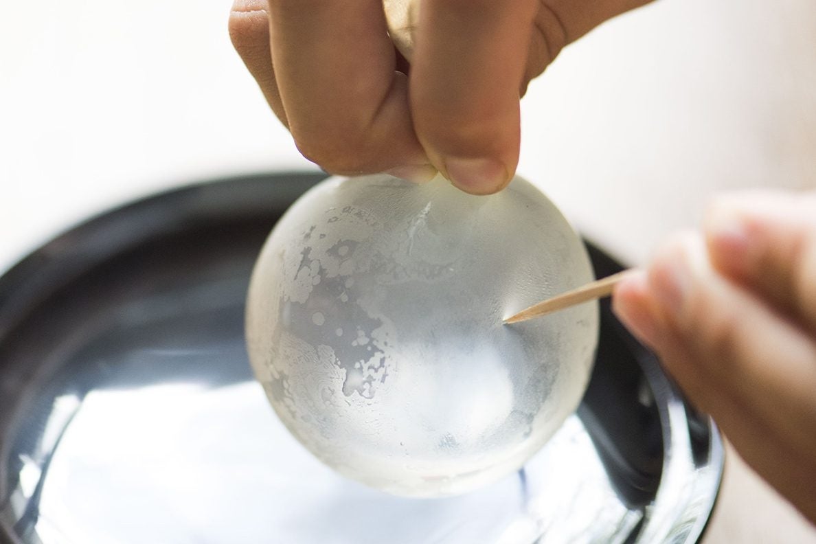当店人気No.1ロングセラー商品「水まる餅」。口に入れた瞬間からとろける美味しさと、水風船を割るとプルンと飛び出す様子が話題を呼び、“口でも目でも楽しめる和菓子”としてご好評をいただいております。