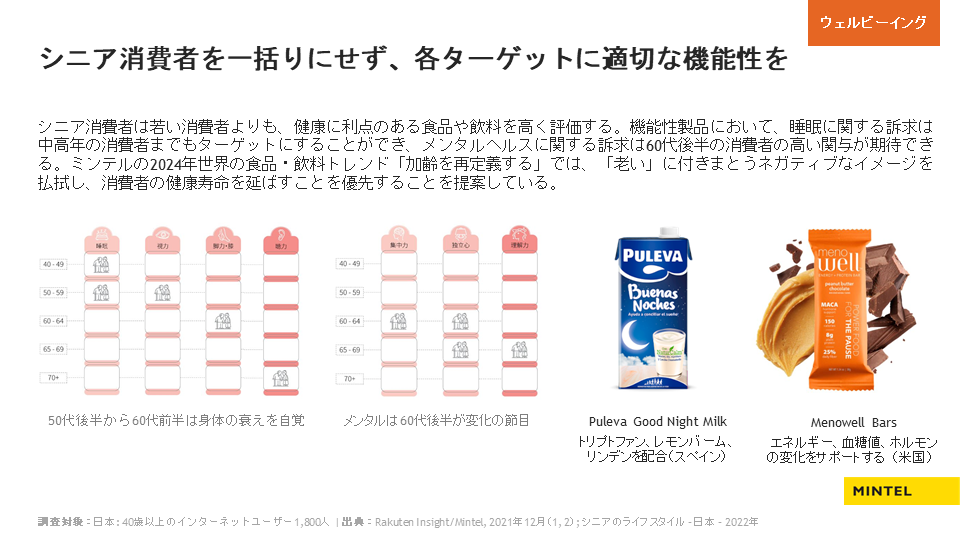 食品の購入において重視される特定の栄養素や機能性は、乳製品にも当てはまります。こういった健康上の利点を提供する製品で、今後も重要な消費者層であるシニアをターゲットにする場合の重要な戦略について、新⾕はミンテルが2023年10⽉に発表した「2024年:世界の⾷品・飲料トレンド」の1つである、「加齢を再定義する」に触れました。このトレンドでも紹介しているように、消費者の健康寿命を伸ばすことをサポートする製品にビジネスチャンスが⾒いだせるとし、乳製品を使⽤した製品例を挙げました。