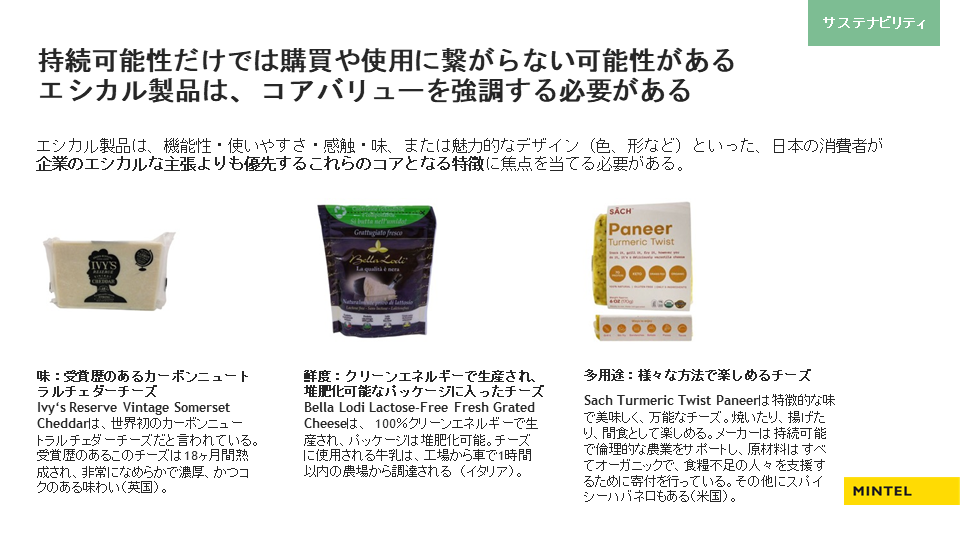 最後のサステナビリティについては、「単に持続可能性を強調したり、エシカルな製品であるだけでは⽇本の消費者を獲得することはできない。」とし、「欧⽶諸国の取り組みを参考にしながら、製品のコアバリューを強調する必要がある」と提案しました。なお、アイルランドは、食品サプライチェーンのあらゆる段階において持続可能性の改善を推進するプログラム「オリジン・グリーン」に国家的に取り組んでおり、食品の持続可能性においては先進的な活動を行っています。