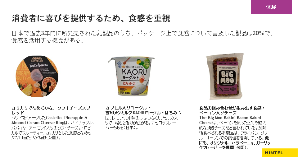 チーズは心地よさや楽しさを与える食品として楽しまれることに触れ、新⾕は、「乳製品の⾷体験を楽しくさせるため、味や⾷感を活⽤することができます。」と述べました。⾷感を活⽤した国内外の乳製品の例として、ハワイからインスピレーション受けたチーズスプレッドや、ベーコンを使ったチーズなどを紹介しました。