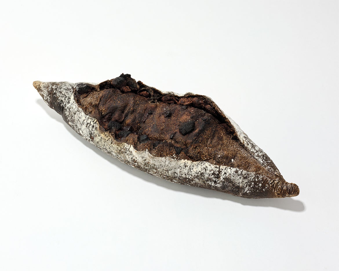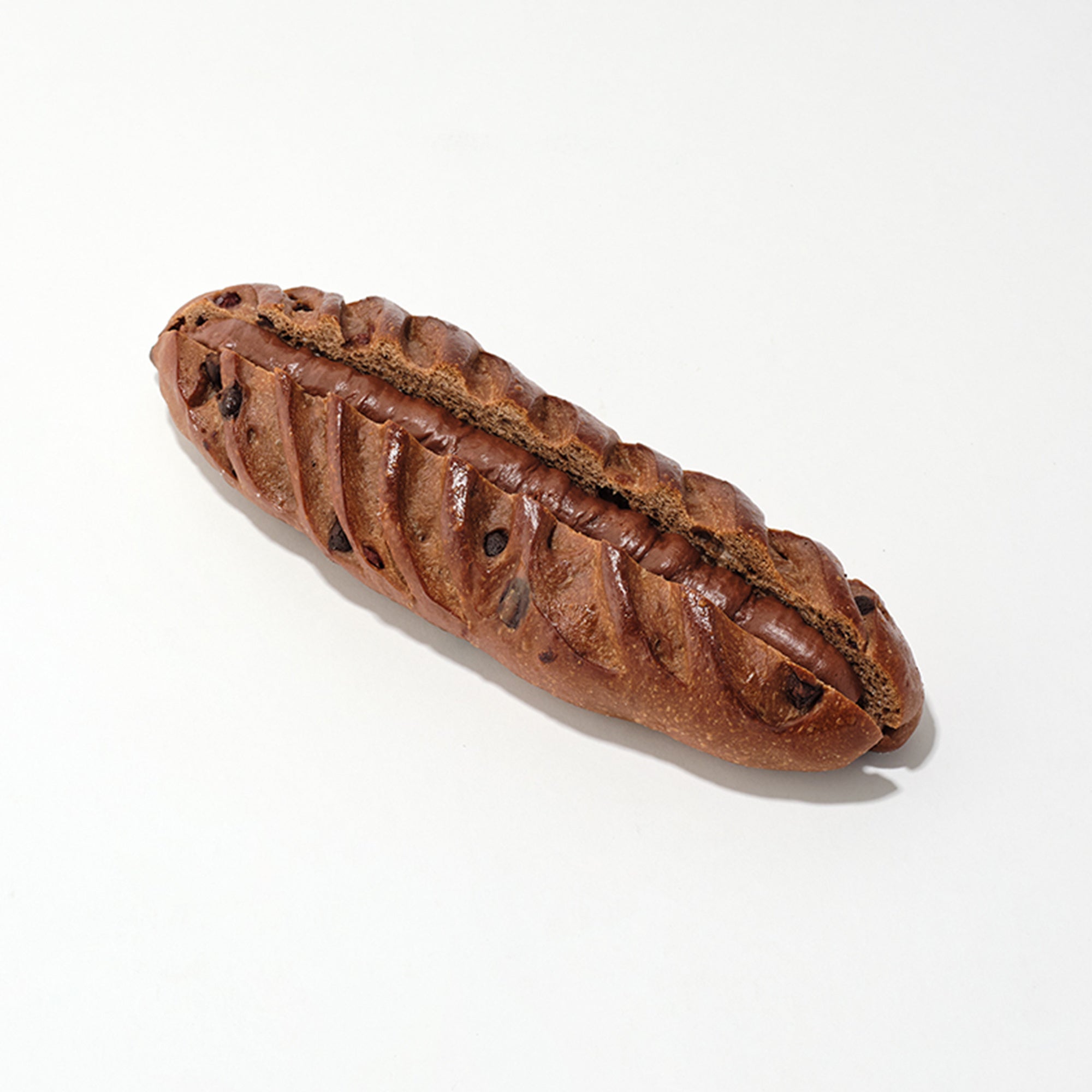 トラディション生地にブラックココアを練りこみ、2種類のチョコを巻き込み焼き上げた「ショコラバゲット」。軽くリベイクすることで、上品な甘さがさらに広がります。