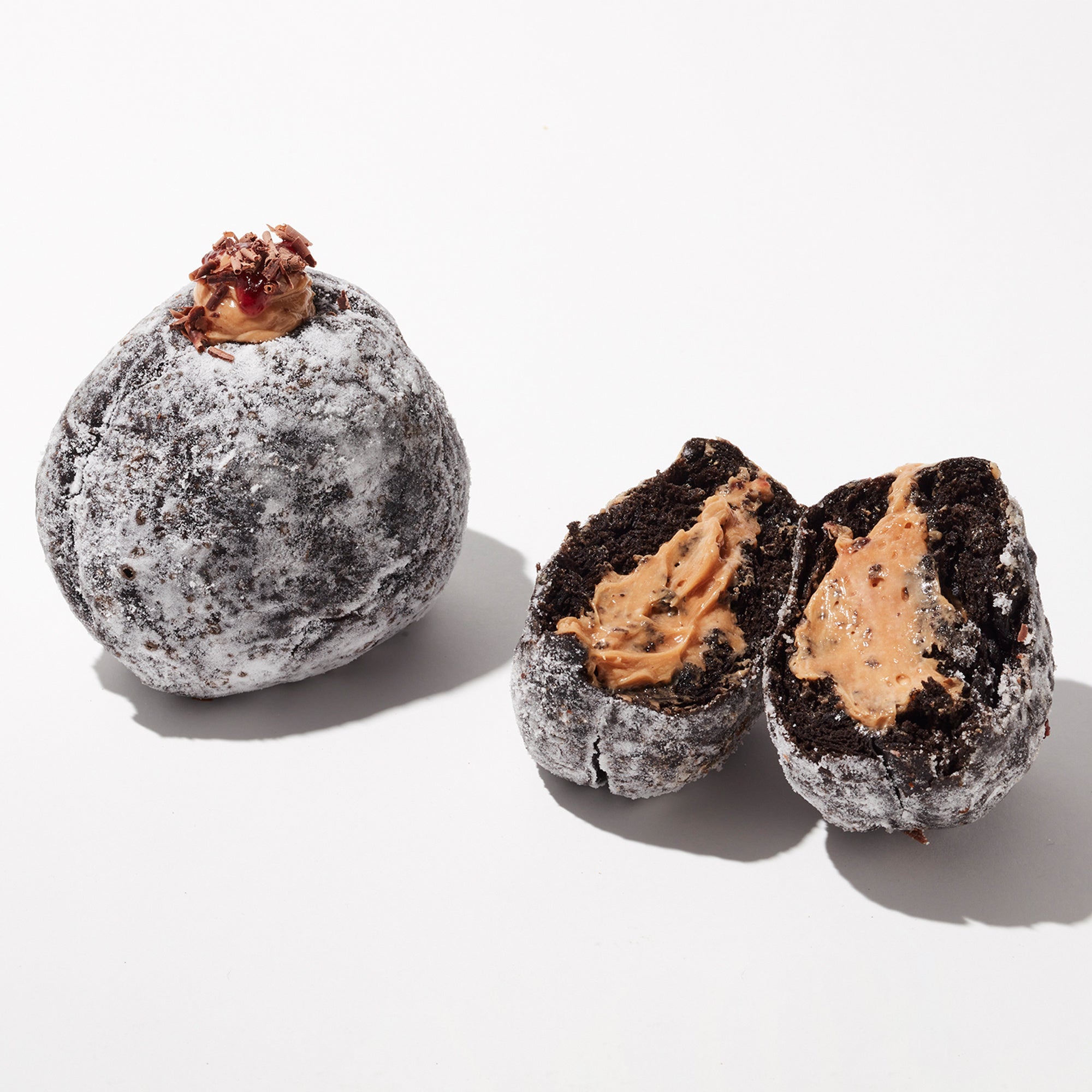 歯切れの良い真っ黒生地に、自家製プラリネクリームをたっぷり絞りアクセントにいちごジャムをトッピングしました。