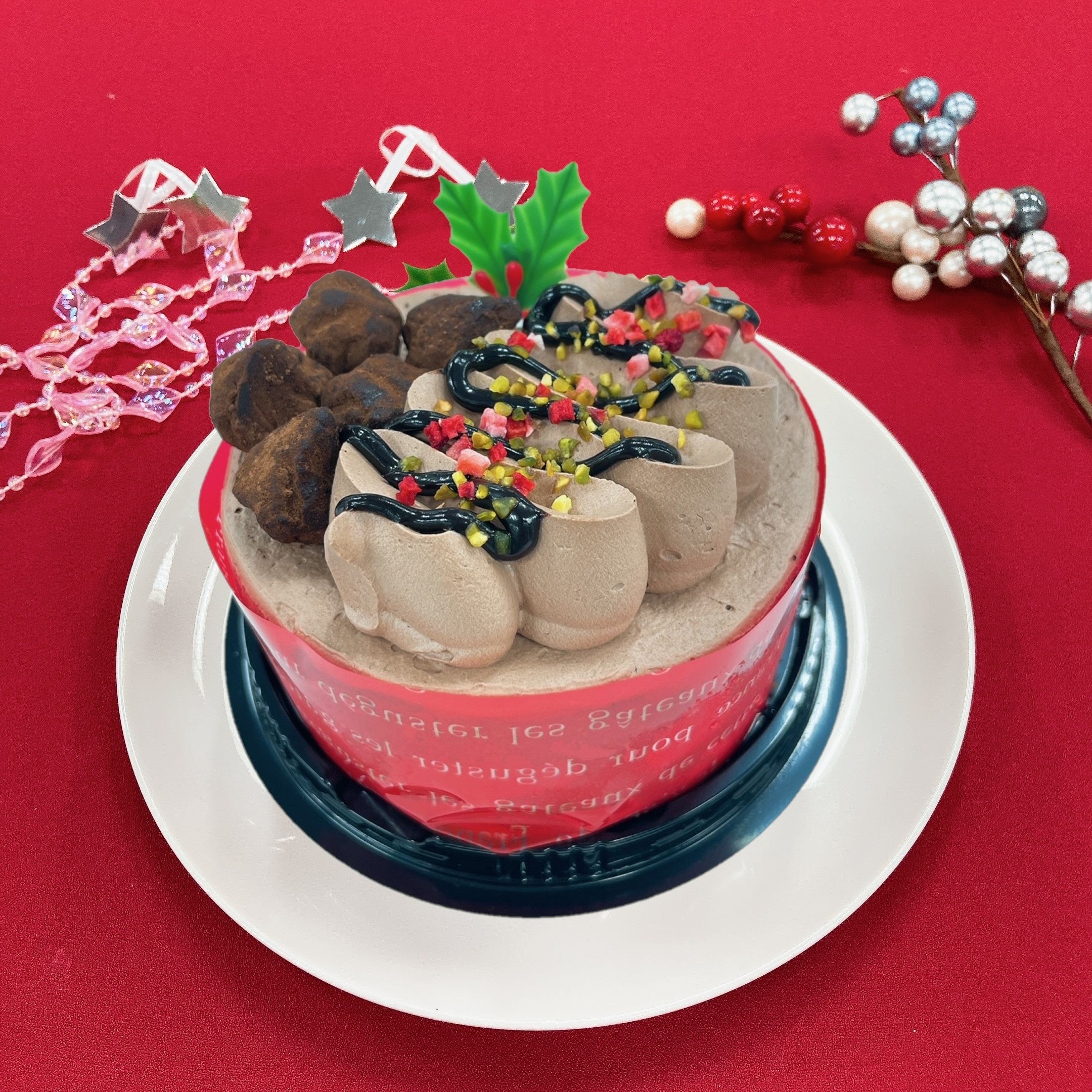 スポンジ生地とチョコホイップクリームをベースにしたケーキに、生チョコトリュフやフリーズドライストロベリー、ピスタチオ、チョコソースでクリスマスらしく華やかに仕上げたチョコレートケーキです。大人もお子さまも楽しめる、チョコづくしなケーキです。