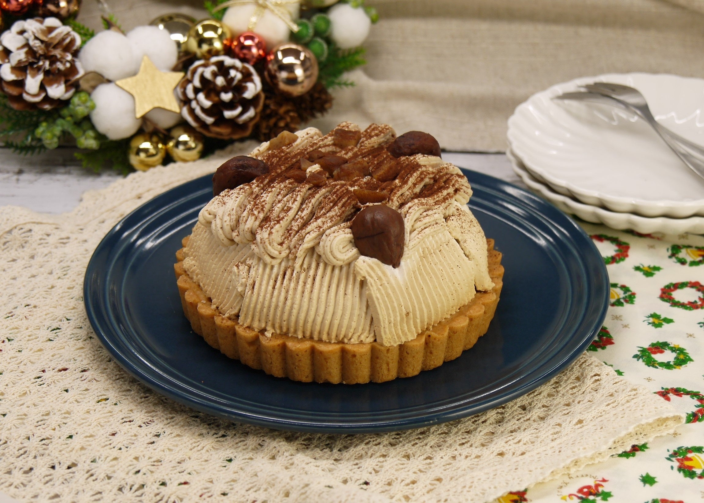 ミルクムースとマロンホイップクリームで仕立てたケーキの上に、モンブランホイップクリームとマロンダイス、大きな渋皮栗の甘露煮をトッピングした、ボリューム感たっぷりのモンブランケーキです。