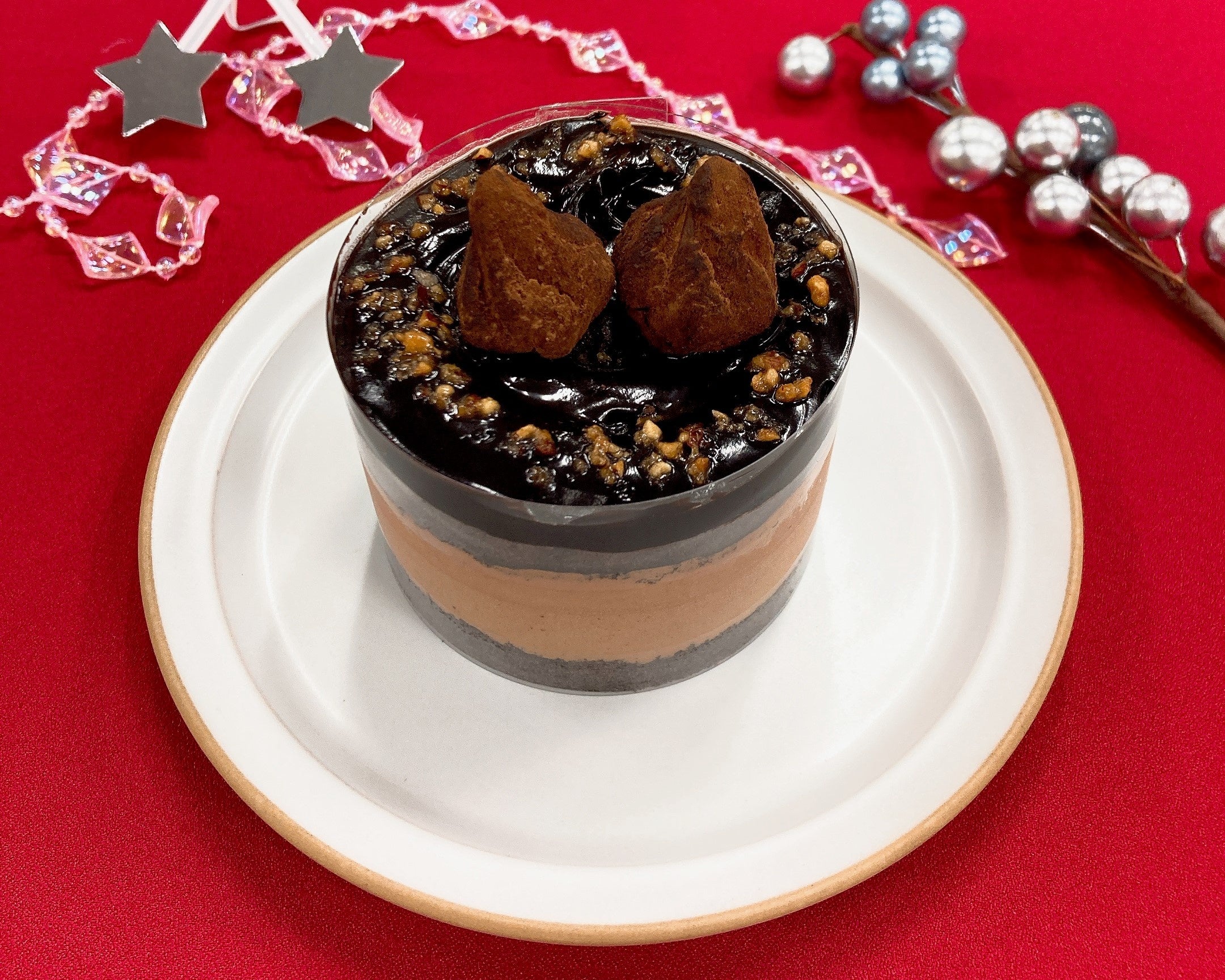 ココアスポンジにチョコムース、艶のあるグラサージュショコラを合わせた3層仕立てのチョコレートケーキです。さらに生チョコトリュフを2つトッピングし、チョコ尽くしのクリスマスにぴったりのひと品です。