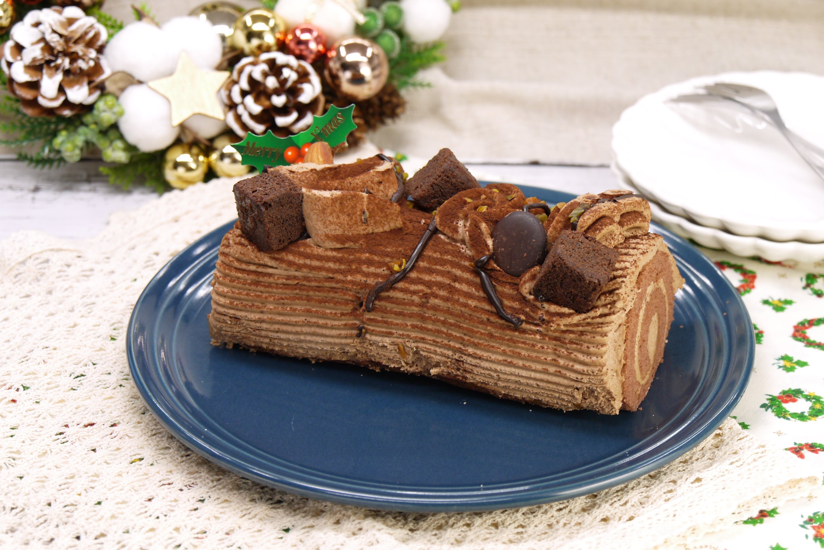 3種のベルギーチョコを加えて仕立てたクリームでロールケーキを巻き上げ、仕上げにもベルギーチョコクリームを使用しています。上部にナッツやチョコレートをトッピングし、木の丸太のように可愛らしく仕上げています。