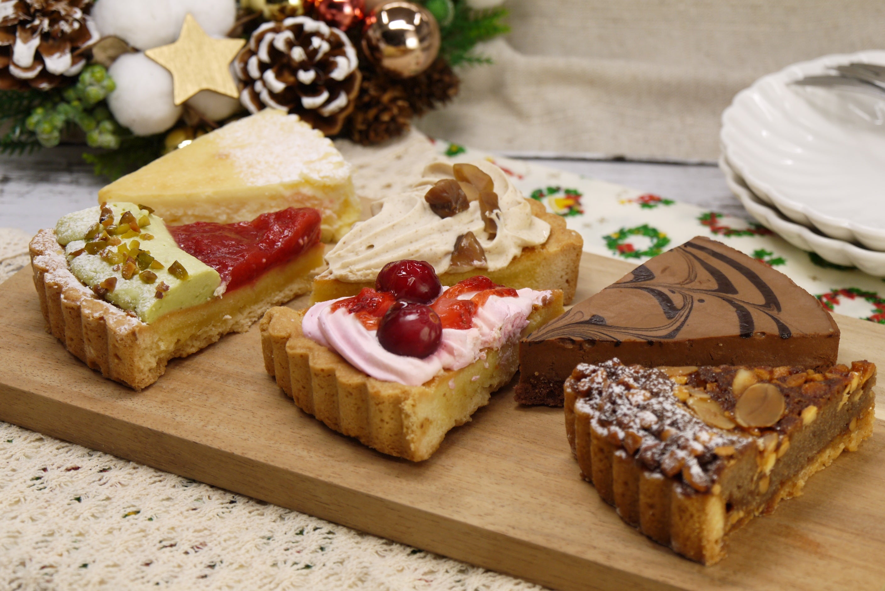 「ベイクドチーズケーキ」「ピスタチオと苺のタルト」「モンブランタルト」「ベリータルト」「ベルギーチョコムース」「フロランタンショコラタルト」の6種のアソートケーキです。チョコやチーズ、フルーツソースを彩り良く組み合わせ、クリスマスらしく華やかに仕立てています。