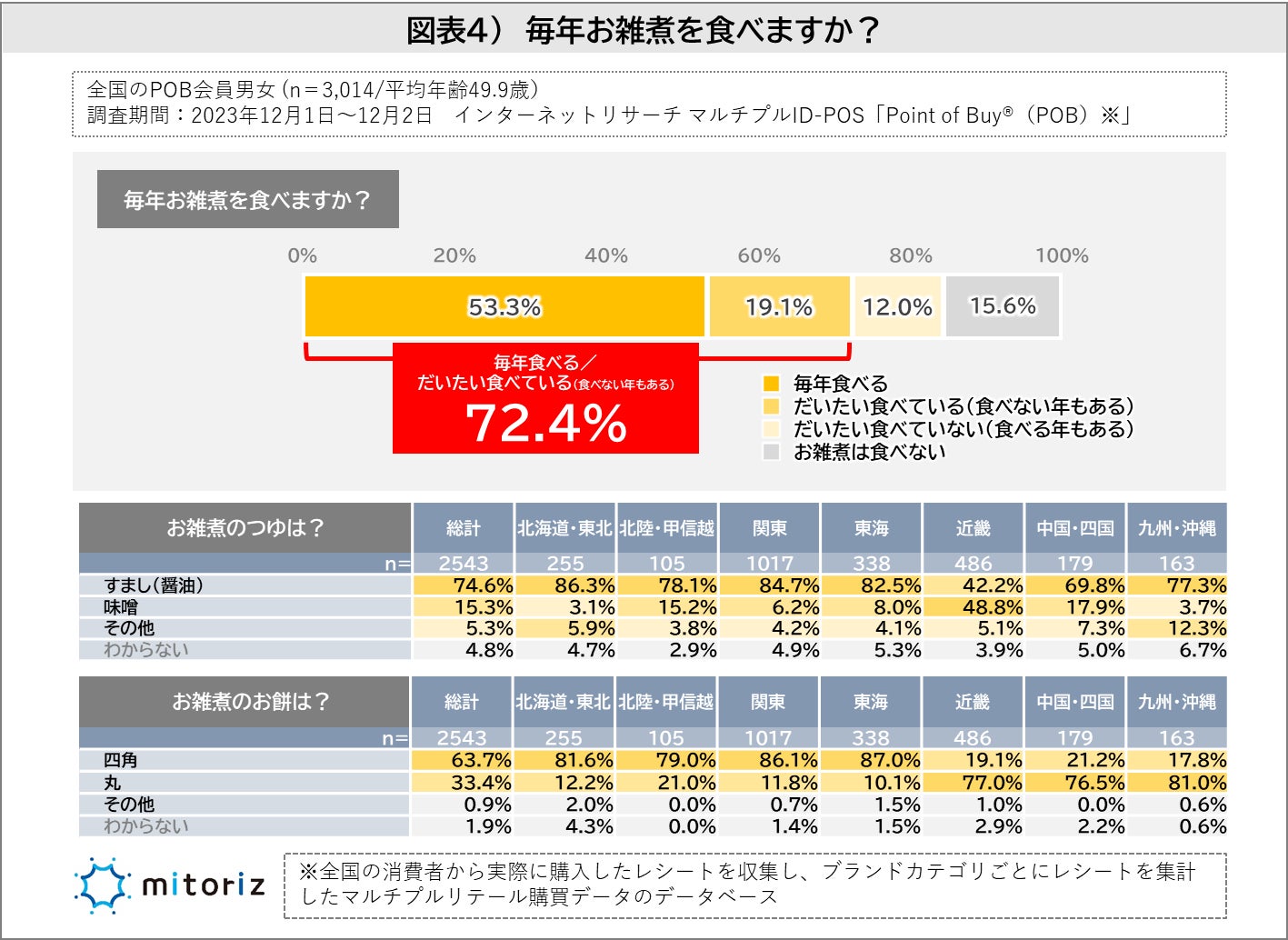 お雑煮を食べるか尋ねたところ「毎年食べる/だいたい食べている(食べない年もある)」と回答した人は72.4%でした。お雑煮のつゆに関しては7割以上が「すまし(醤油)」と回答しており、近畿エリアのみ「味噌」の比率が最も高い結果となりました。お雑煮のお餅は、東海から東では8割程度が「四角」と回答する一方で、近畿から西では8割近くが「丸」と回答し、地域ごとに特徴が見られます(図表4)。