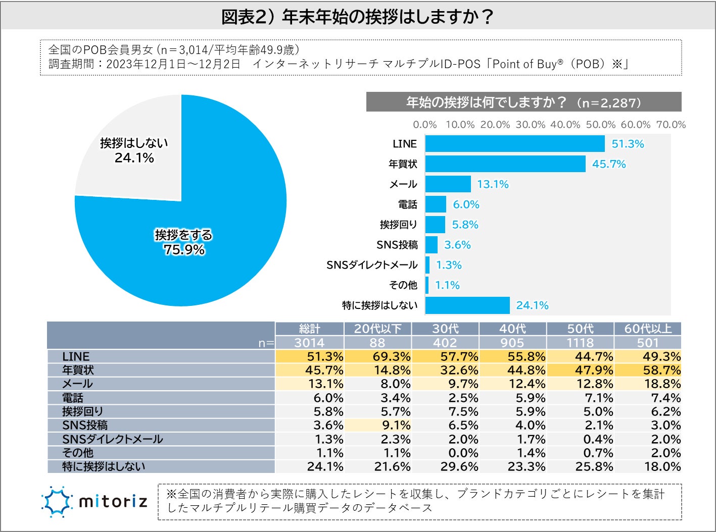 年始の挨拶に関して尋ねたところ、75.9%の人が「挨拶をする」と回答しました。挨拶の手段としては「LINE(51.3%)」が最も多く、2番目に多かったのは「年賀状(45.7%)」という結果でした。年代別では40代以下まで「LINE」の比率が最も高い一方、50代以上は「年賀状」が根強く利用されるており、最も比率が高い手段となりました。20代以下を除き、3番目に多かった手段は「メール」となりましたが、20代以下のみ「メール」を上回り、「SNS投稿」が選ばれていることが特徴的です(図表2)。