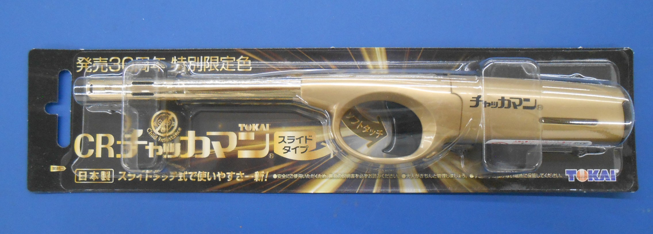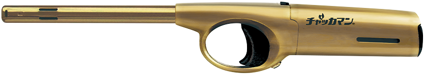 チャッカマンゴールドのモデルには着火レバーの先端を奥にスライドさせることで着火できるスライドタイプを採用。スライドタイプはチャイルドレジスタンス機能を持ちながらも、従来の着火レバー全体を押し込むハードプッシュ式よりも指が痛くなりづらく、軽い力で火がつくのが特徴です。チャッカマンゴールドは見た目だけでなく使いやすさも兼ね備えた優れものです。