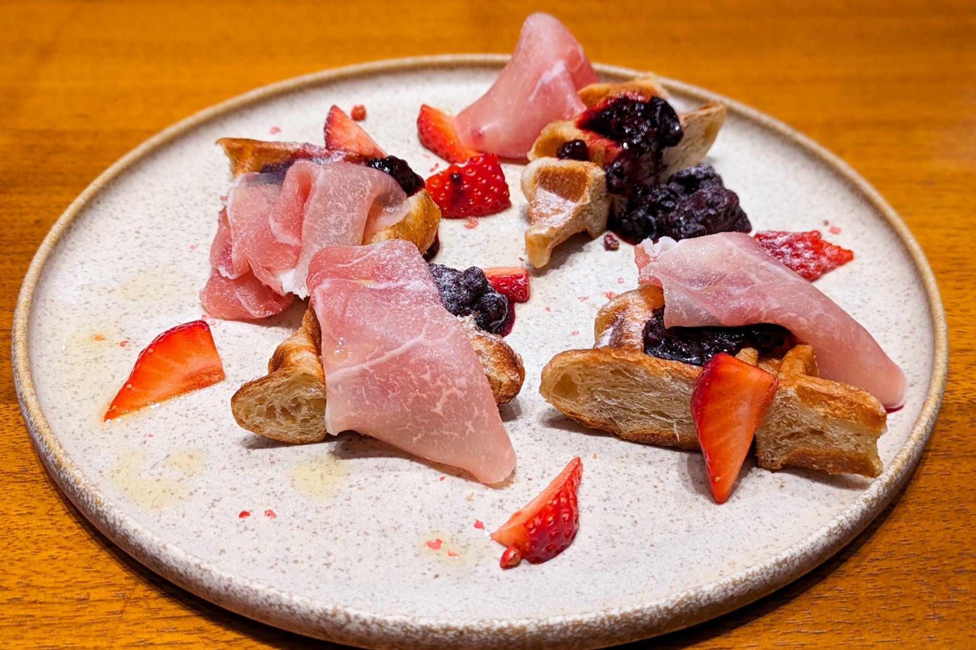 焼きたてのクロッフルに生ハムの塩味とベリーの甘味と酸味を合わせました。