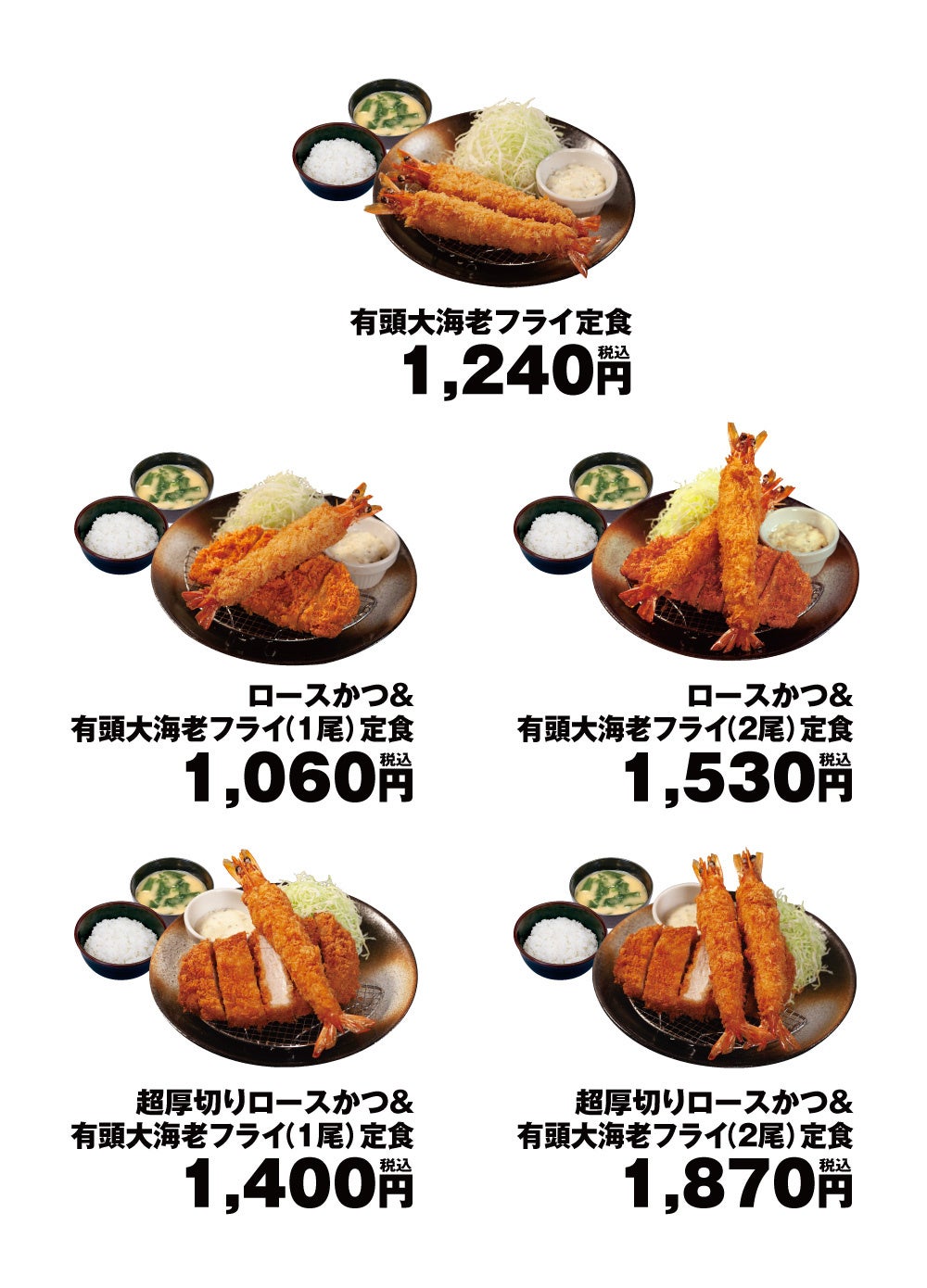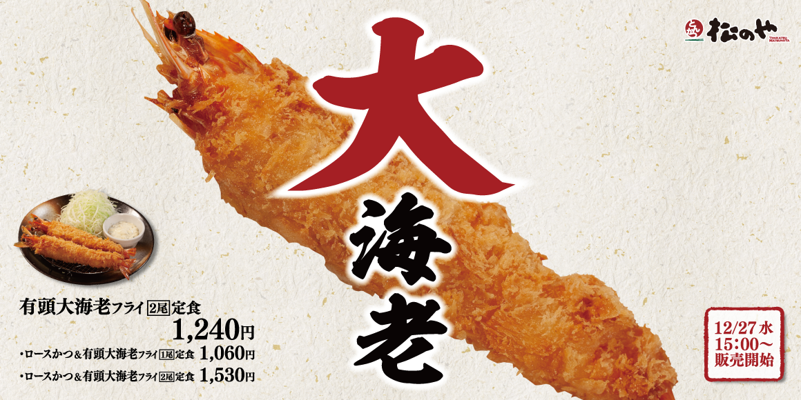 商品名 有頭大海老フライ定食(2尾) 1,240円 ロースかつ&有頭大海老フライ定食(1尾) 1,060円 ロースかつ&有頭大海老フライ定食(2尾) 1,530円 超厚切りロースかつ&有頭大海老フライ定食(1尾) 1,400円 超厚切りロースかつ&有頭大海老フライ定食(2尾) 1,870円 ※お持ち帰りいただけます。お持ち帰りのみそ汁は、別途60円でお買い求めいただけます。 ※全て税込価格です。また、店内・お持ち帰りの税込価格は同一です。 ※株主優待券は上記全てのメニューにご使用いただけます。(単品は除きます。) ※「超厚切りロースかつ&有頭大海老フライ定食」は沖縄店舗、松屋併設店舗では販売いたしません。 発売日 2023年12月27日(水)午後3時 対象店舗 一部店舗を除く全国の松のや |