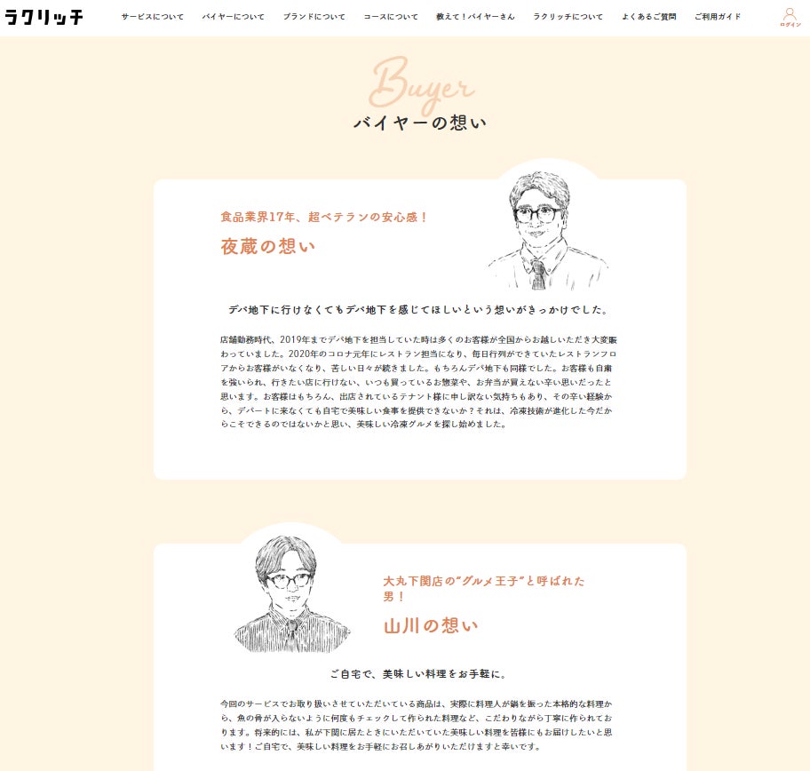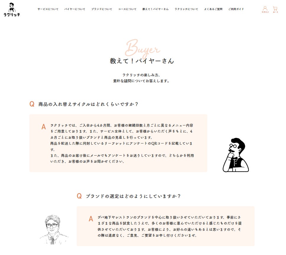 ラクリッチのサービスのカギとなるバイヤー。サイトリニューアルでは、バイヤーのラクリッチと皆様に対する想いをしっかり届けたいと考え、「バイヤーの想い」を掲載しています。また、ラクリッチをお客様により楽しんでいただけるように、「教えて!バイヤーさん」では、サービスを開始して以来、お客様から寄せられた素朴な疑問にお答えしています。