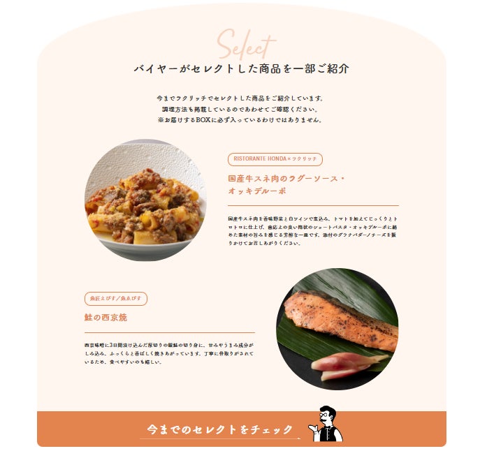 またラクリッチは、お客様にメニュー内容の全容はお見せせず、一部の商品のみ公開することで「届いたときのお楽しみ」を演出し、”おまかせ”でおいしい出会いを提供してきました。サイトリニューアルにより、これまで通りコースの全容はお見せしませんが、「今までセレクトした商品」のページで、各コースでこれまでお客様にお届けしてきた商品をご覧いただけるようになりました。