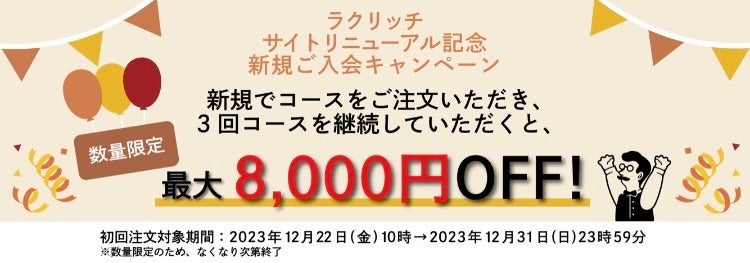 ラクリッチの対象BOXを新規でご注文いただき、3回継続していただくと、最大8,000円OFFでラクリッチをお楽しみいただけます。