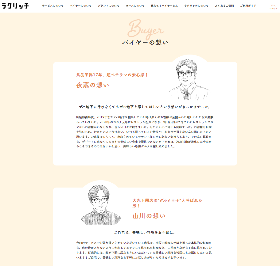ラクリッチのサービスのカギとなるバイヤー。サイトリニューアルでは、バイヤーのラクリッチと皆様に対する想いをしっかり届けたいと考え、「バイヤーの想い」を掲載しています。また、ラクリッチをお客様により楽しんでいただけるように、「教えて!バイヤーさん」では、サービスを開始して以来、お客様から寄せられた素朴な疑問にお答えしています。