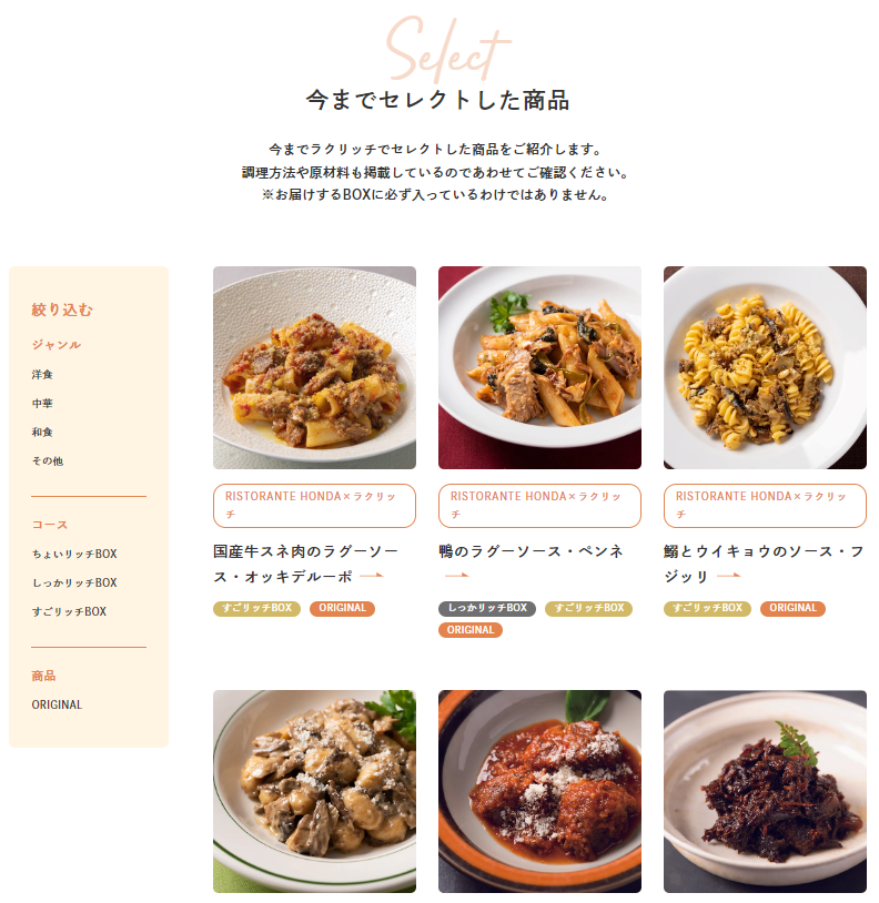 またラクリッチは、お客様にメニュー内容の全容はお見せせず、一部の商品のみ公開することで「届いたときのお楽しみ」を演出し、”おまかせ”でおいしい出会いを提供してきました。サイトリニューアルにより、これまで通りコースの全容はお見せしませんが、「今までセレクトした商品」のページで、各コースでこれまでお客様にお届けしてきた商品をご覧いただけるようになりました。
