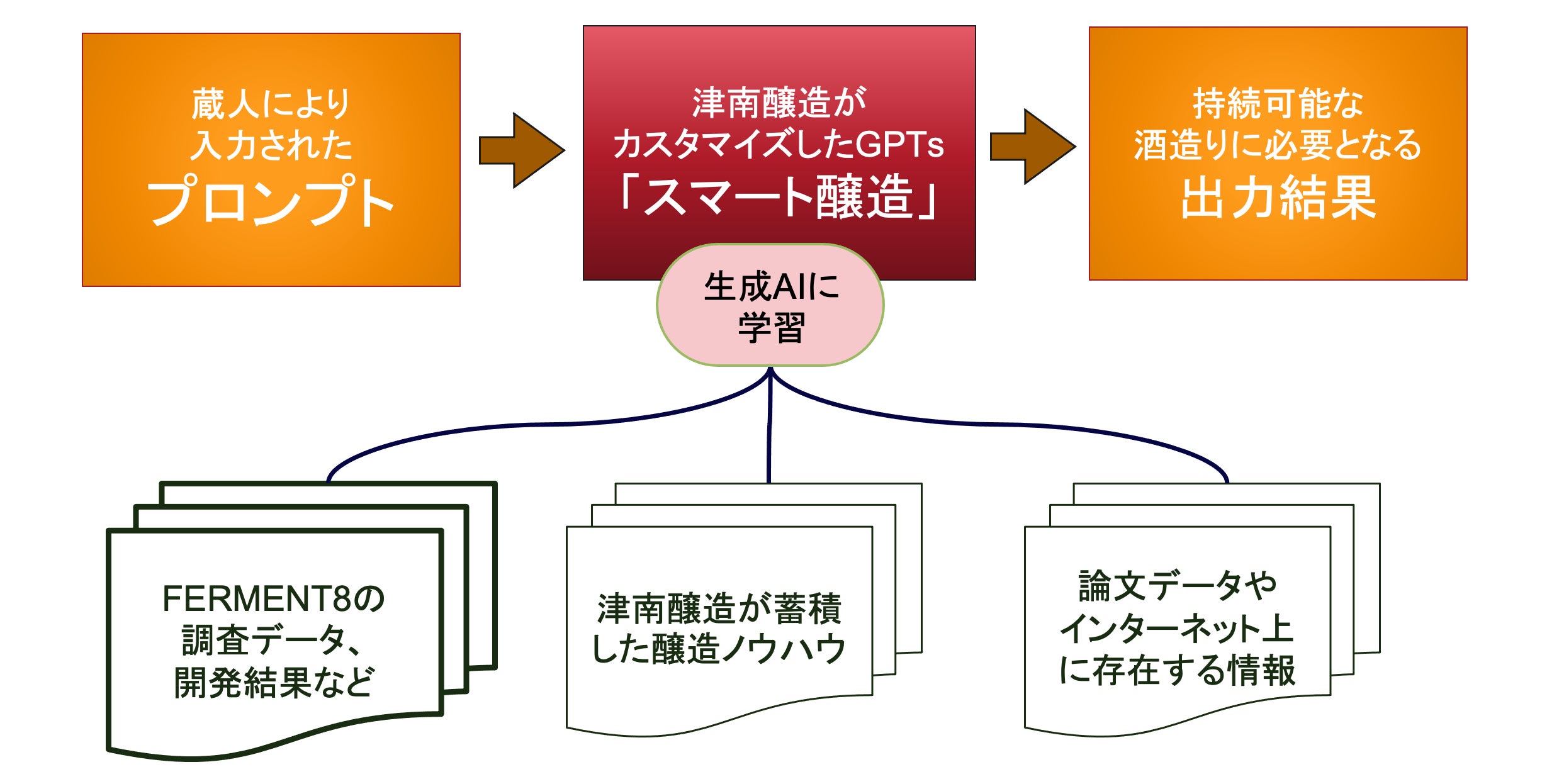 酒造りは、原料である米をはじめ、麹や酵母といった醸造微生物、蔵の環境である温度や湿度、さらにはその空間に空気中のちりや微生物などの組み合わせによって、完成する日本酒の味は無限の可能性を秘めています。 まさに酒造りの中にアートとサイエンスを感じることができます。 これらの膨大な知恵と経験、さらには研究結果を最大限活用して、将来的に持続可能な酒造りを実現するため、今回生成AIを利用したスマート醸造システムの開発に至りました。