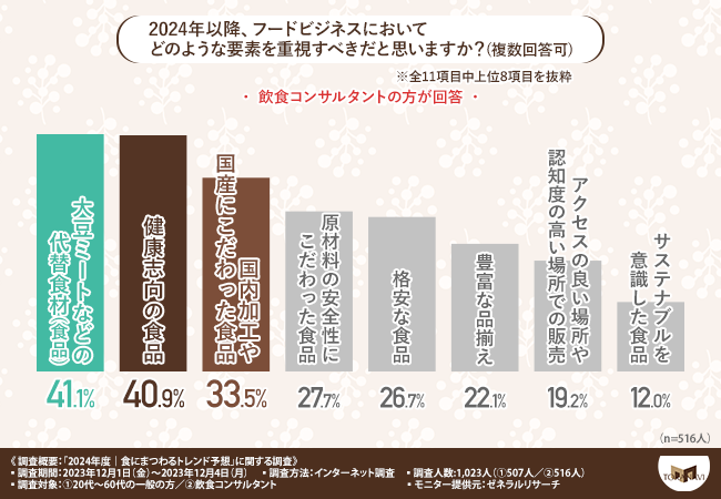 「2024年以降、フードビジネスにおいてどのような要素を重視すべきだと思いますか?(複数回答可)」と質問したところ、『大豆ミートなどの代替食材(食品)(41.1%)』と回答した方が最も多く、次いで『健康志向の食品(40.9%)』『国内加工や国産にこだわった食品(33.5%)』と続きました。