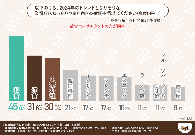 「以下のうち、2024年のトレンドとなりそうな業種(取り扱う商品や業務内容の種類)を教えてください(複数回答可)」と質問したところ、『和食(45.4%)』と回答した方が最も多く、次いで『洋食(31.6%)』『中華料理(30.0%)』と続きました。