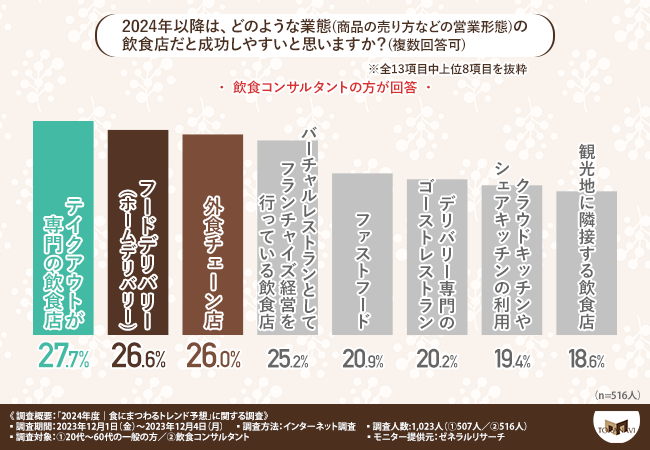 そこで、「2024年以降は、どのような業態(商品の売り方などの営業形態)の飲食店だと成功しやすいと思いますか?(複数回答可)」と質問したところ、『テイクアウトが専門の飲食店(27.7%)』と回答した方が最も多く、次いで『フードデリバリー(ホームデリバリー)(26.6%)』『外食チェーン店(26.0%)』と続きました。