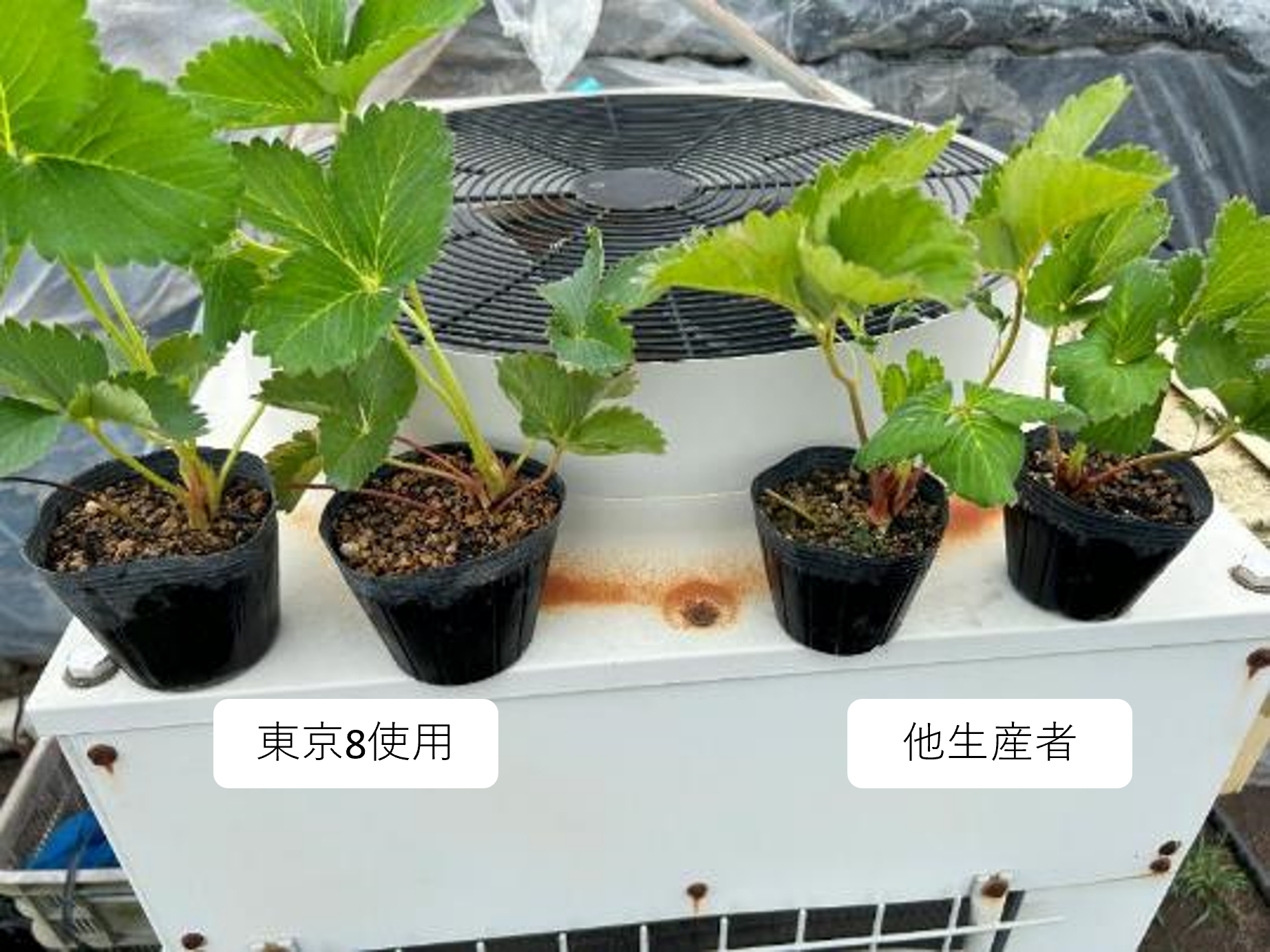 本年8月、長崎県島原半島の圃場でイチゴの育苗に「東京8」を使用した実験を行い、その効果を発揮したことをご報告いたします。