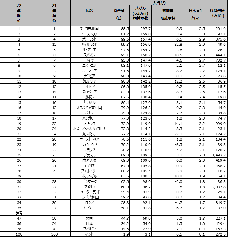 ・日本は34.2L、大びん633ml換算で約54.0本(前年+1.5本)と前年増になりました。