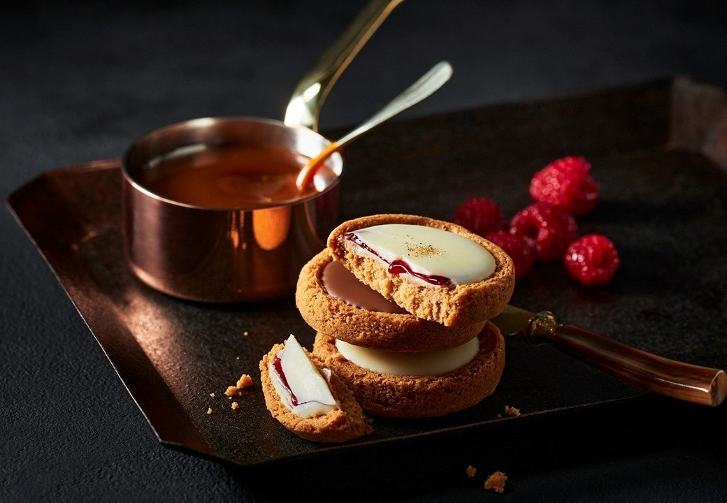 ロレーヌ産岩塩を加え、甘さの奥にほんのり塩味を感じられる、コク深くまろやかな味わいの「キャラメルソース」、色鮮やかで華やかな香りの「ラズベリーソース」。ひと口かじるととろっとあふれるソースがサブレの味わいをリッチに。