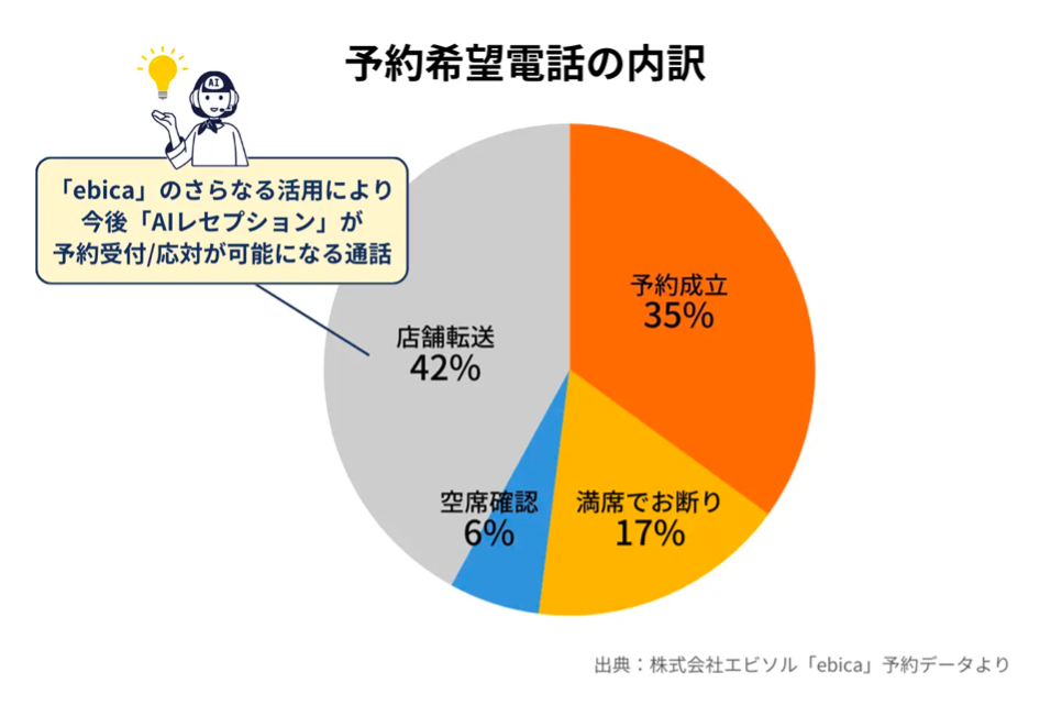 また、「ebica」と合わせて全店舗に導入したAI電話予約応対サービス「AIレセプション」が、すでに店舗にかかってくる電話の半数近くを自動応対し、スタッフの作業負担を大幅に軽減。通常の予約電話だけではなく、“今空いているかどうか”の空席確認や満席時のお断りをAIスタッフが完結させています。これにより、昨今、人手不足によってスタッフ1人あたりの業務負荷が増大しているなか、テクノロジーが人に代わることができる業務を支援することで、スタッフはより目の前のお客様に対して高い品質のサービスを提供できるようになるなど、店舗の顧客満足度向上に寄与しています。