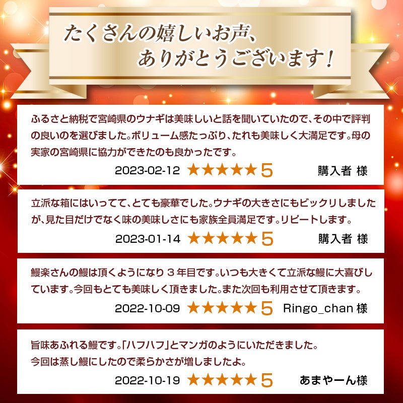 本企画は、日頃のご愛顧に対する感謝の気持ちを込めた返礼品「鰻楽」蒲焼き(2尾400g以上・4尾840g以上)を数量限定で掲載・受付するものです。