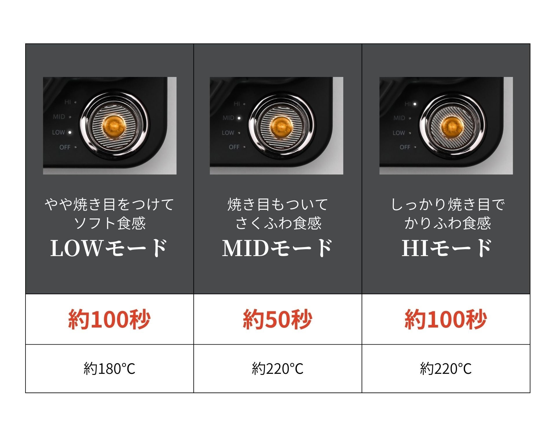 LOW(約180℃/余熱時間 約1分20秒/焼き上げ時間 約1分40秒)