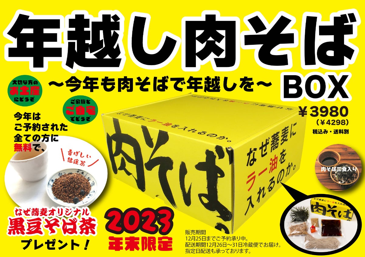 通常12/30、12/31に店頭販売する『年越しそば』が麺、つゆ、ラー油のシンプルな1人前セットなのに比べ、『年越し肉そばBOX』はさらに肉、海苔、ゴマを加えた3人前のセットを専用のBOXにてお届けします。