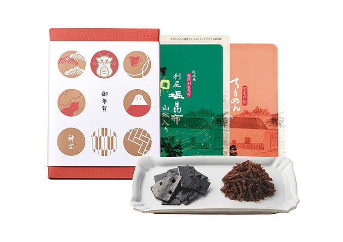 ↑〈神宗〉お年賀限定パッケージ ON-2 利尻塩昆布90g、ちりめん山椒90g 税込2,160円 [賞味期限]1カ月