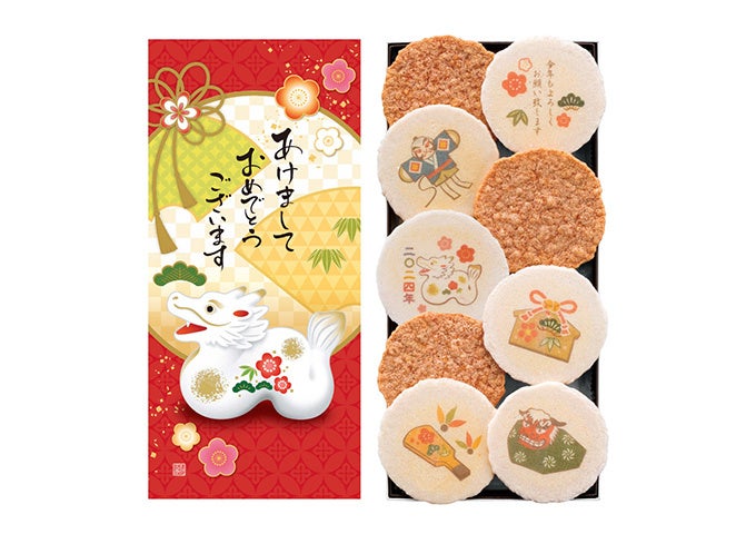 2024年の干支である辰やお正月ならではのモチーフを描いたえびせんべいと、桂新堂定番の香ばしい赤えび炙り焼きの詰合せ。「今年もよろしくお願いします」とメッセージが入ったえびせんべいも含まれ、年始のご挨拶のお品としてもおすすめ。